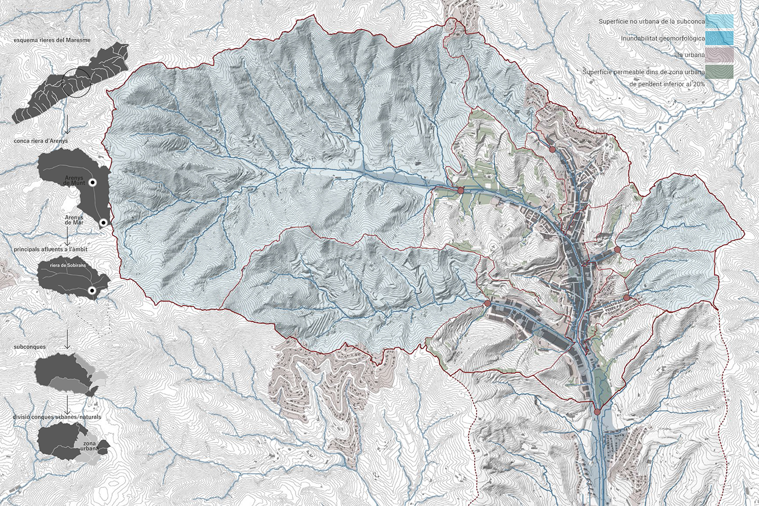 Estudi i caracterització gràfica de l’àmbit fluvial d’Arenys de Munt, representant el drenatge natural vs. el drenatge artificial, així com les dinàmiques de cada cas. La proposta d’estudi s’emmarca en el cicle de l’aigua com a eina de projecte i transformació.