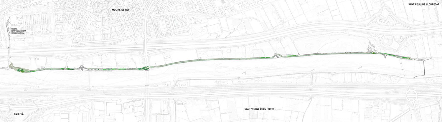 La intervenció està dins del projecte metropolità del Parc Riu Llobregat que permet la connexió a través de la plana fluvial donant continuïtat al camí paral·lel al curs del riu. Amb la voluntat de condicionar la totalitat del front fluvial potenciant-ne la recuperació de l’ecosistema per afavorir la seva biodiversitat.