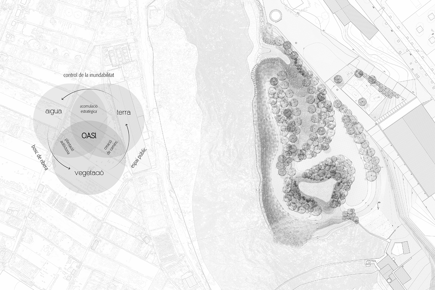 El projecte neix d’un conveni amb l’ajuntament del municipi en el qual els estudiants redacten i executen els projectes executius de cada un dels àmbits fluvials proposats. L’ O A S I és la renaturalització del Parc Fluvial de la Torre del Gas. La proposta genera relleus suaus al terreny estratègics respecte a les inundacions i una plantació de diferents espècies arbòries i arbustives autòctones pròpies del bosc de ribera. En el context de canvi global i emergència climàtica creiem necessàri adoptar noves postures davant la reordenació del nostre entorn, en especial als espais fluvials, on hem de conviure amb l'increment de la periodicitat i potència de les avingudes dels rius mediterranis. Retornar al riu el que és seu és el primer pas.